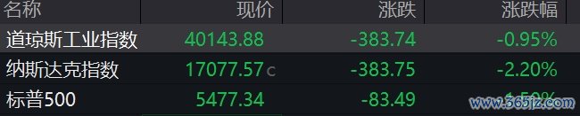 三大指数集体低开,纳指跌超2%。大型科技股下挫,特斯拉、英伟达跌超4%,苹果跌逾1%。超微电脑跌超19%,公司业绩预告远不及预期。星巴克跌超9%,公司第二季度全球销售额降幅超预期。