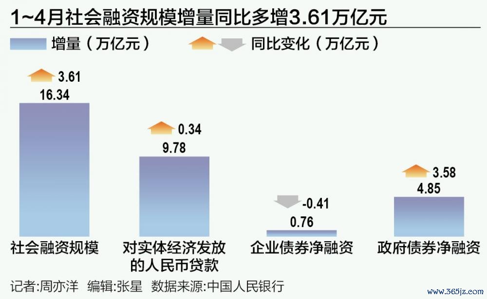 从存量结构看,4月末对实体经济发放的人民币贷款余额占同期社会融资规模存量的61.9%,同比低0.9个百分点;政府债券余额占比20.3%,同比高2.1个百分点;企业债券余额占比7.7%,同比低0.4个百分点。