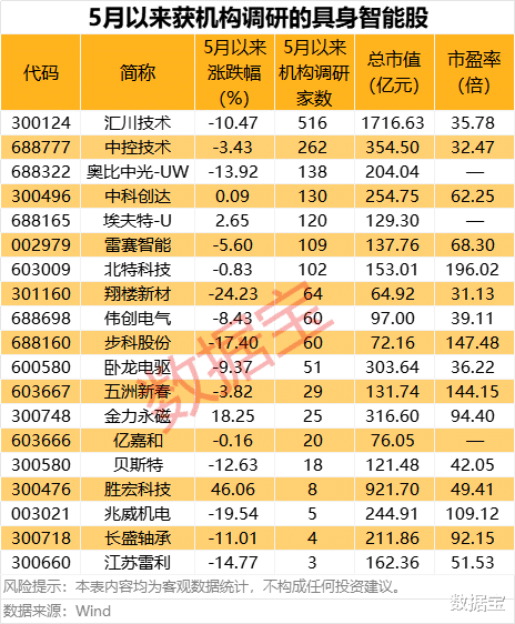 5月以来,具身智能概念股获得机构密切关注,19股获机构扎堆调研,其中汇川技术、中控技术、奥比中光-UW的机构调研家数均超过100家。