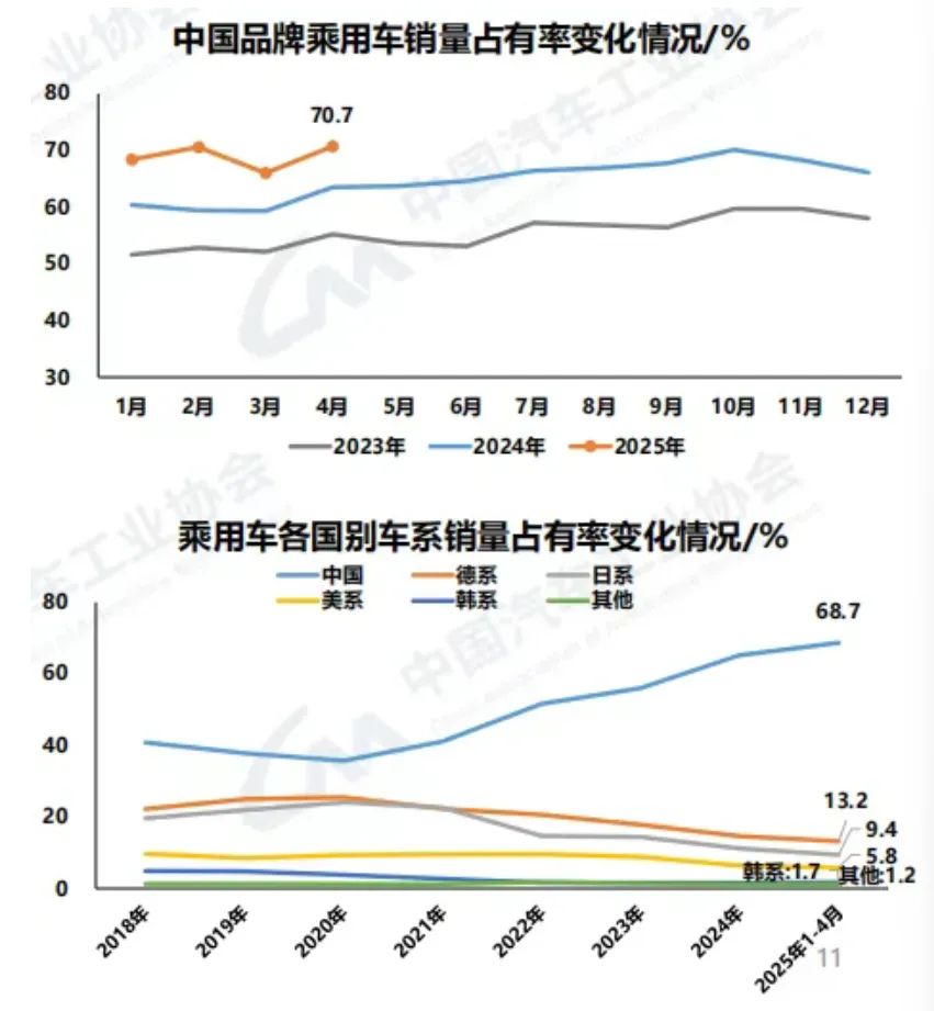 当前,中国品牌的乘用车的 市占率已经 突破70%了, 然而2024年汽车行业利润率仅为4.3%,2025年一季度继续下滑,利润率仅为3.9%,远低于下游工业企业的平均水平。