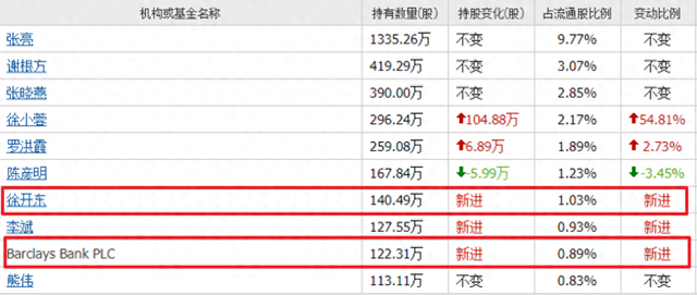 可以看到,在最新的一季度,徐开东直接新进140万股,位列公司第七大流通股东。而且国际顶尖投行之一的巴克莱银行,也同样新进122万股,位列公司第九大流通股东。